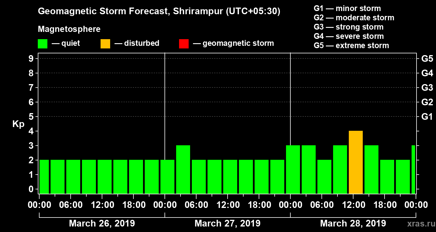 Geomagnetic storm forecast in Shrirampur for Mar 26, 2019