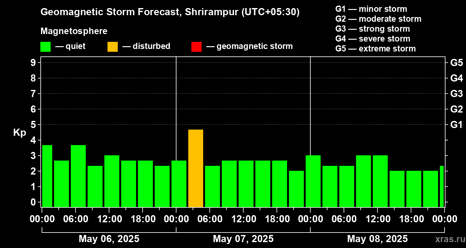 Geomagnetic storm forecast in Shrirampur for May 06, 2025