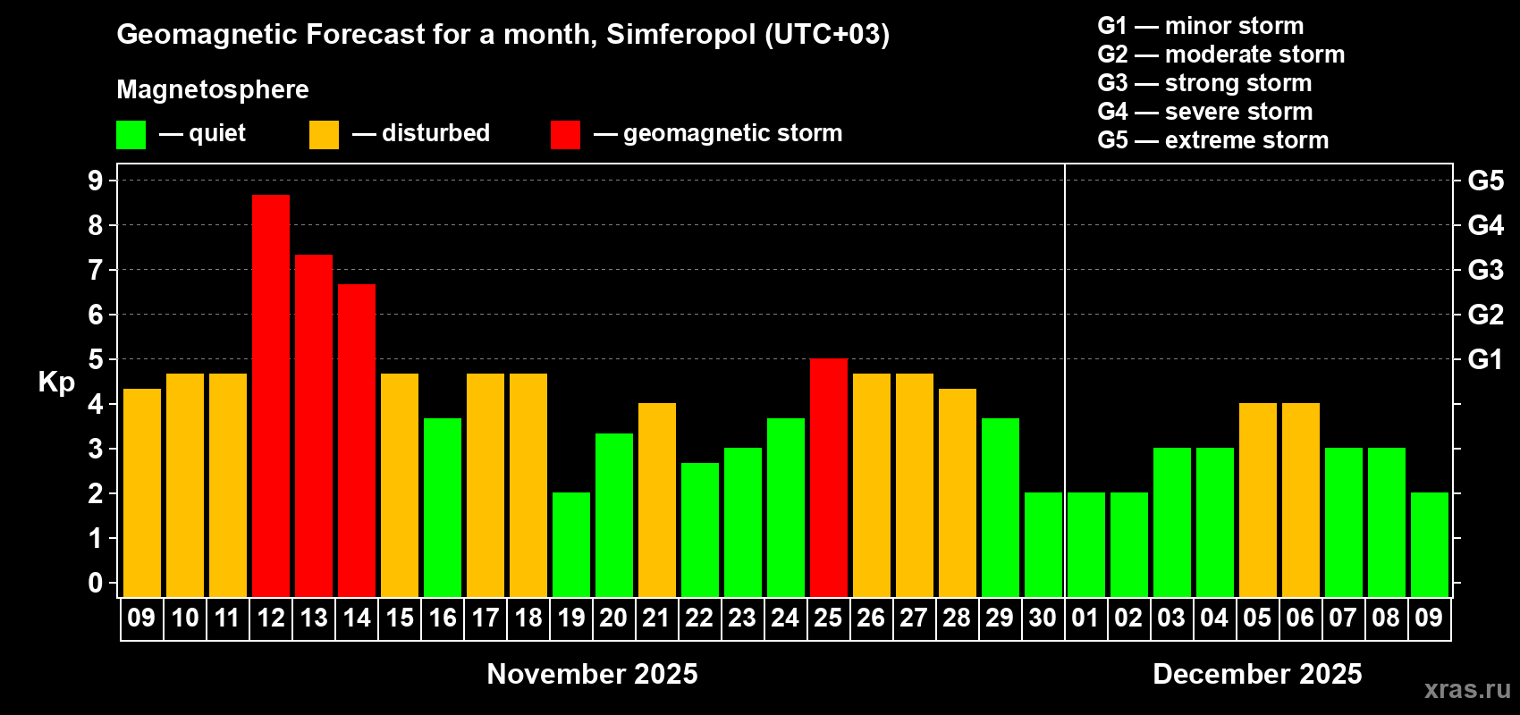 Geomagnetic storm forecast in Simferopol for Nov 09, 2025
