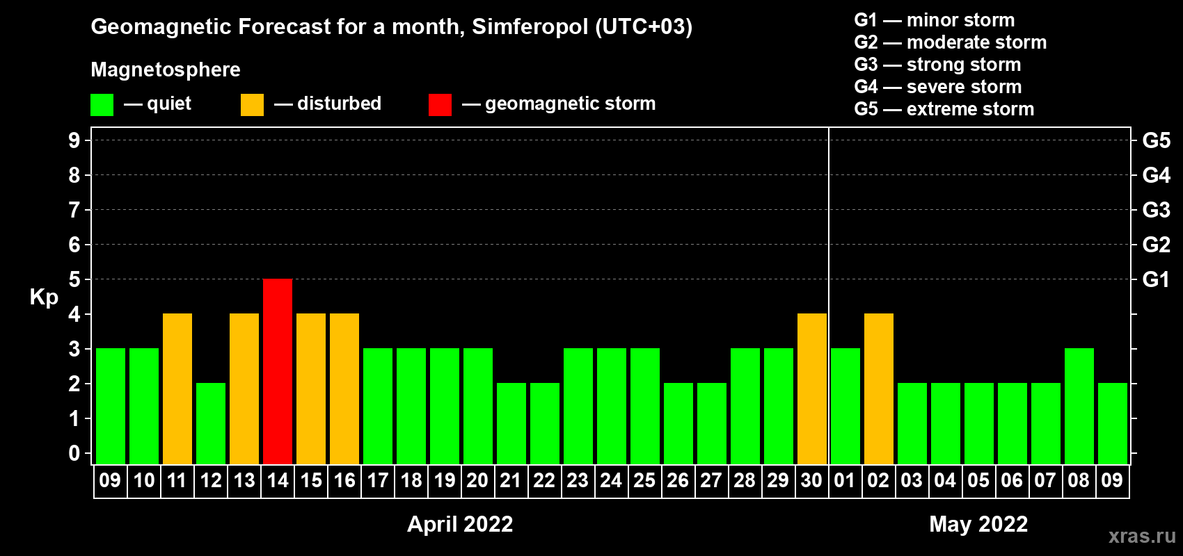 Geomagnetic storm forecast in Simferopol for Apr 09, 2022