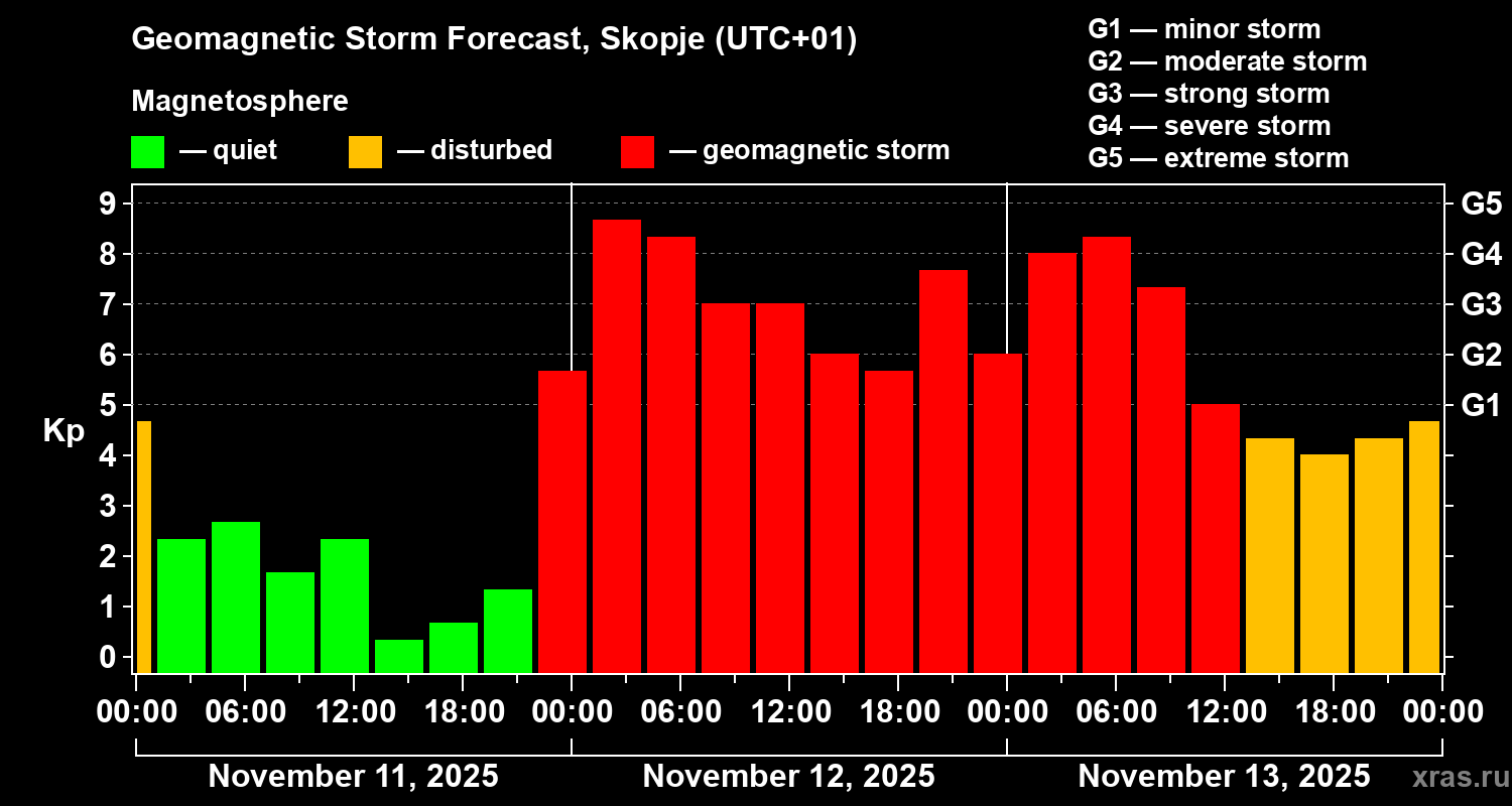 Geomagnetic storm forecast in Skopje for Nov 11, 2025