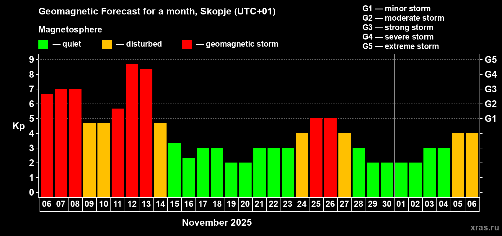 Geomagnetic storm forecast in Skopje for Nov 06, 2025