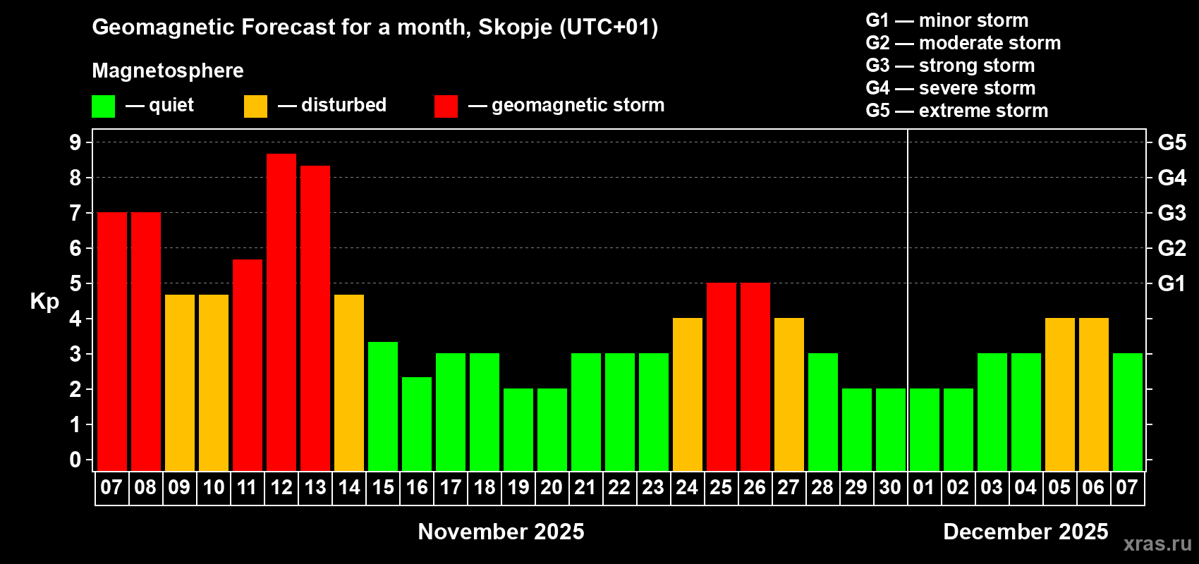 Geomagnetic storm forecast in Skopje for Nov 07, 2025