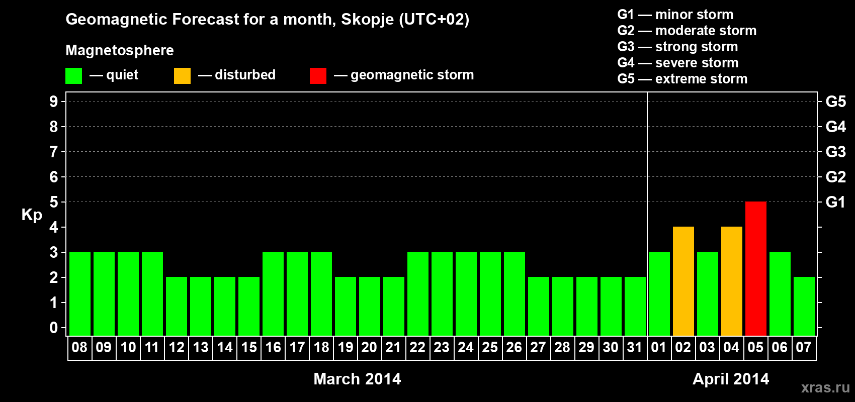 Geomagnetic storm forecast in Skopje for Mar 08, 2014