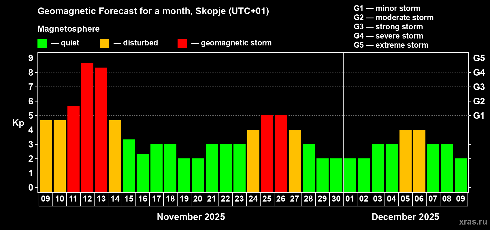Geomagnetic storm forecast in Skopje for Nov 09, 2025