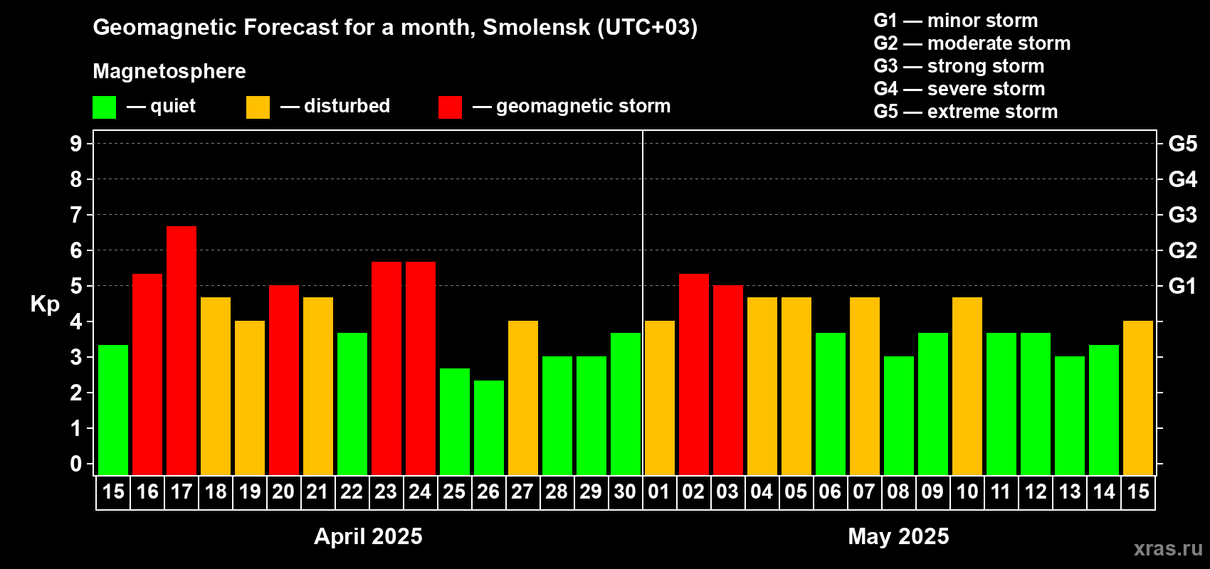 Geomagnetic storm forecast in Smolensk for Apr 15, 2025