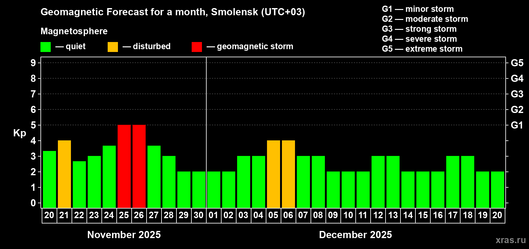 Geomagnetic storm forecast in Smolensk for Nov 20, 2025