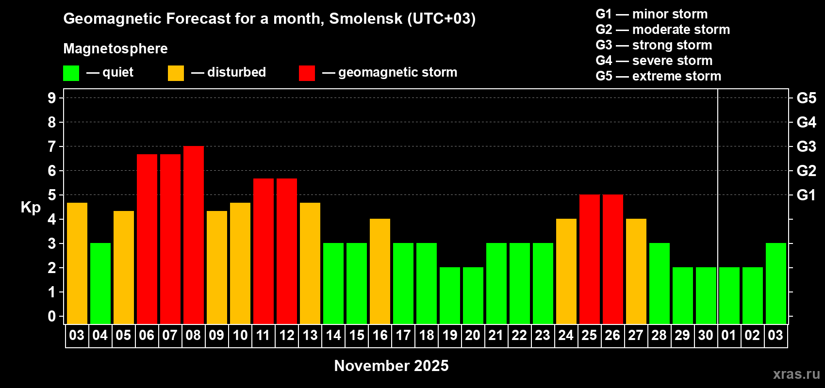 Geomagnetic storm forecast in Smolensk for Nov 03, 2025