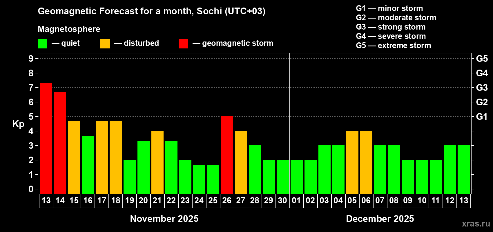 Geomagnetic storm forecast in Sochi for Nov 13, 2025