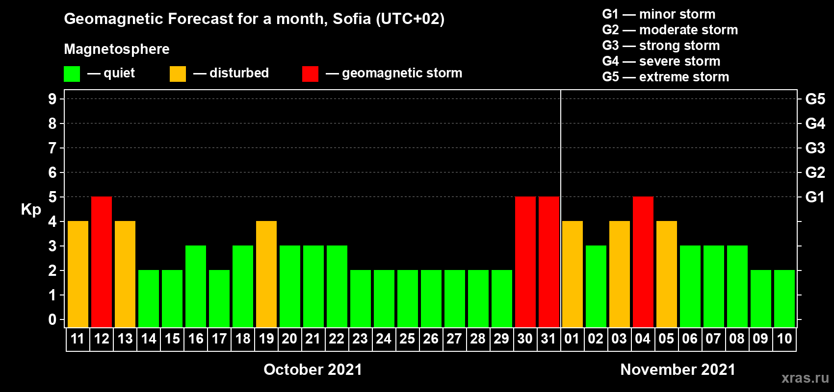 Geomagnetic storm forecast in Sofia for Oct 11, 2021