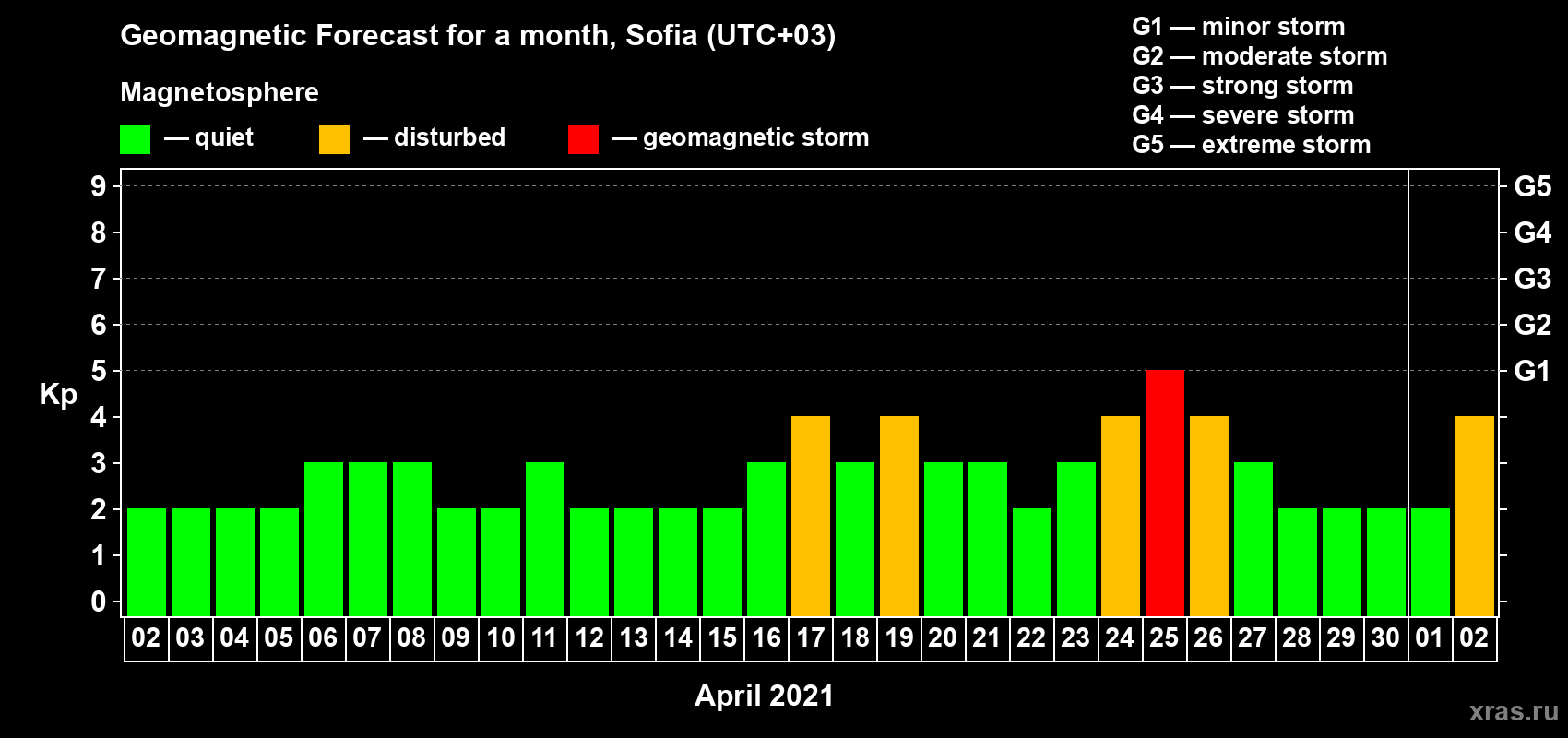Geomagnetic activity forecast in Sofia — Apr 02, 2021