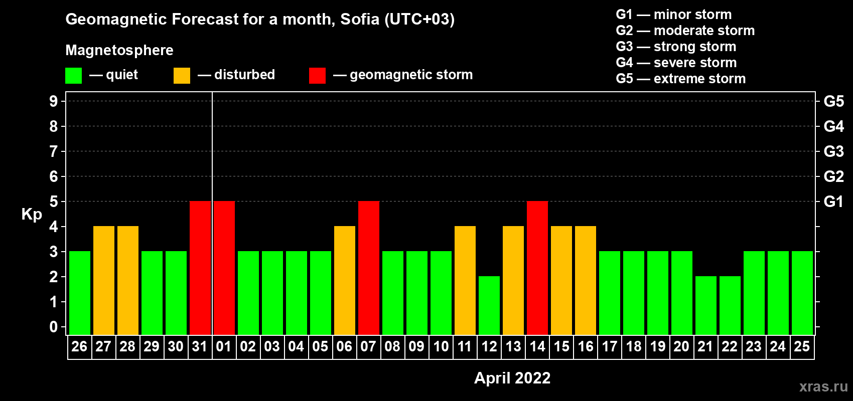 Geomagnetic storm forecast in Sofia for Mar 26, 2022