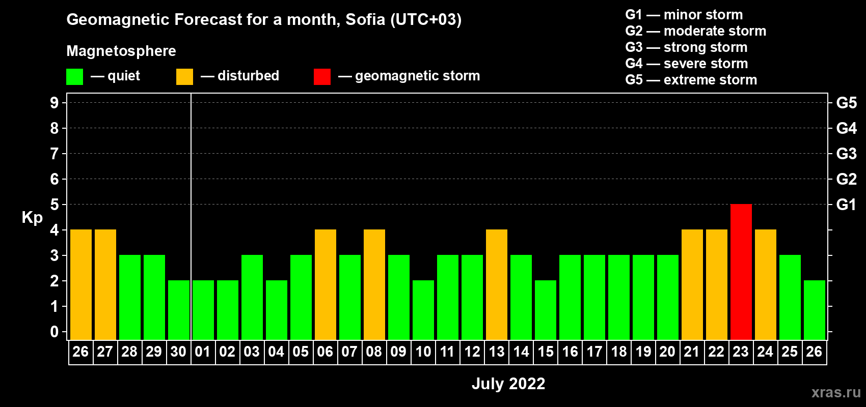 Geomagnetic storm forecast in Sofia for Jun 26, 2022