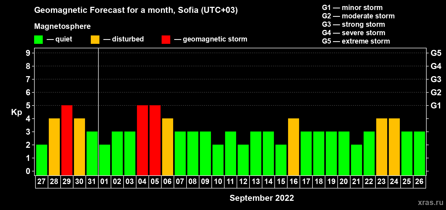 Geomagnetic storm forecast in Sofia for Aug 27, 2022