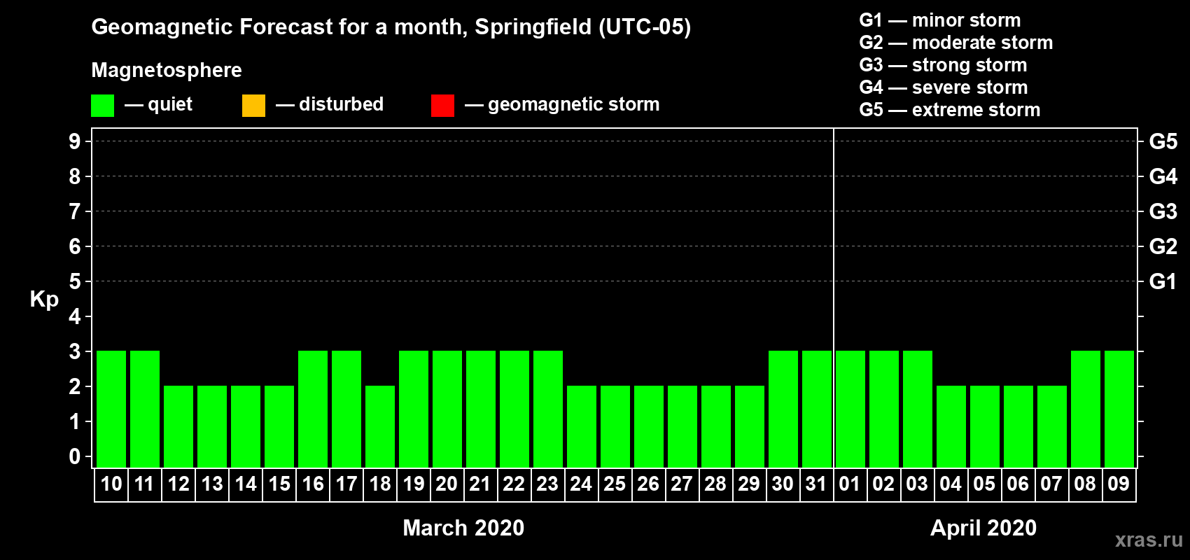 Geomagnetic storm forecast in Springfield for Mar 10, 2020