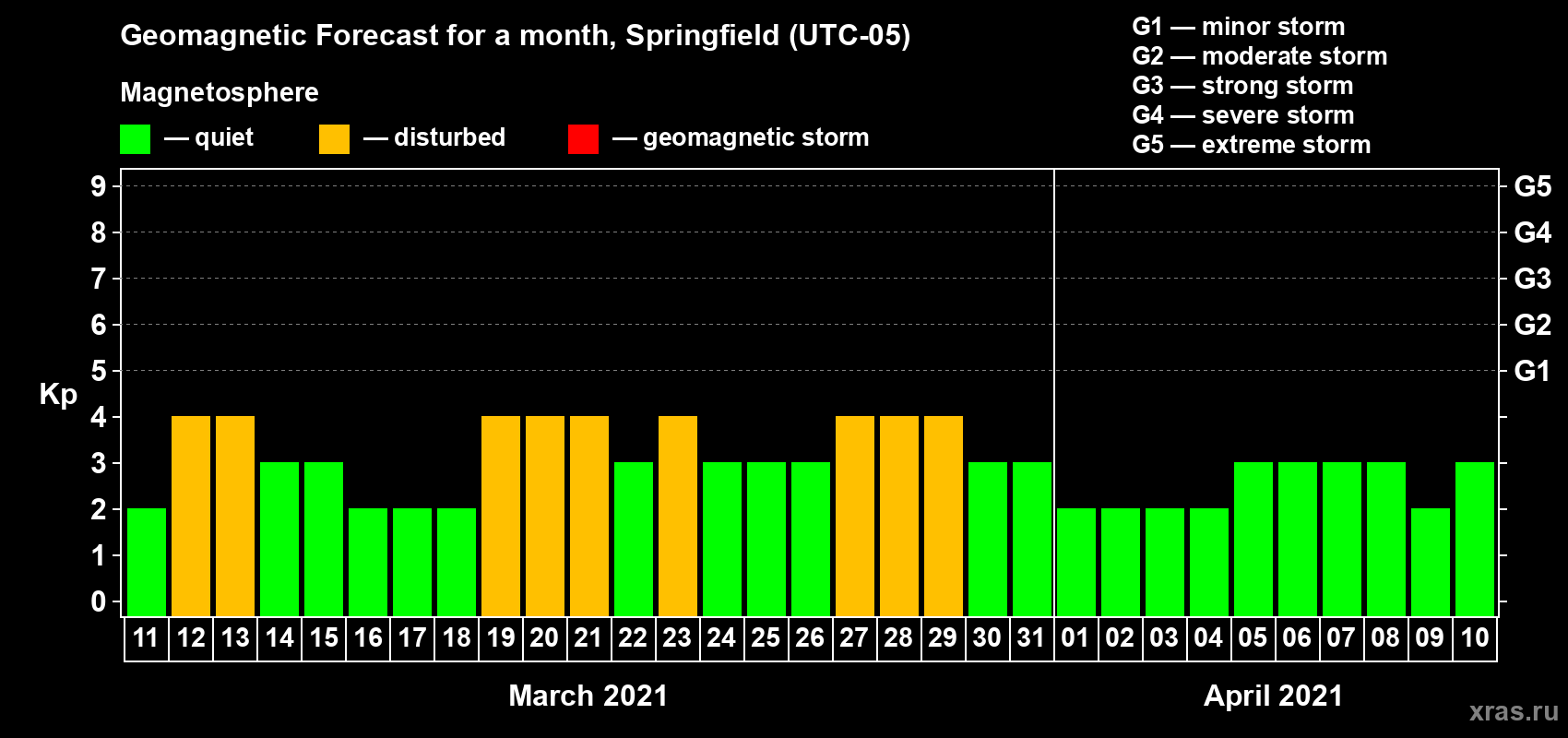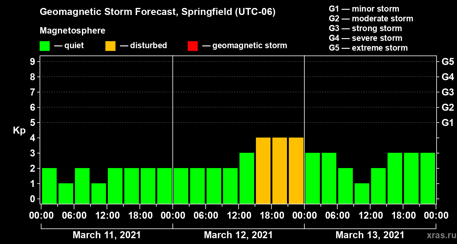 Geomagnetic storm forecast in Springfield for Mar 11, 2021
