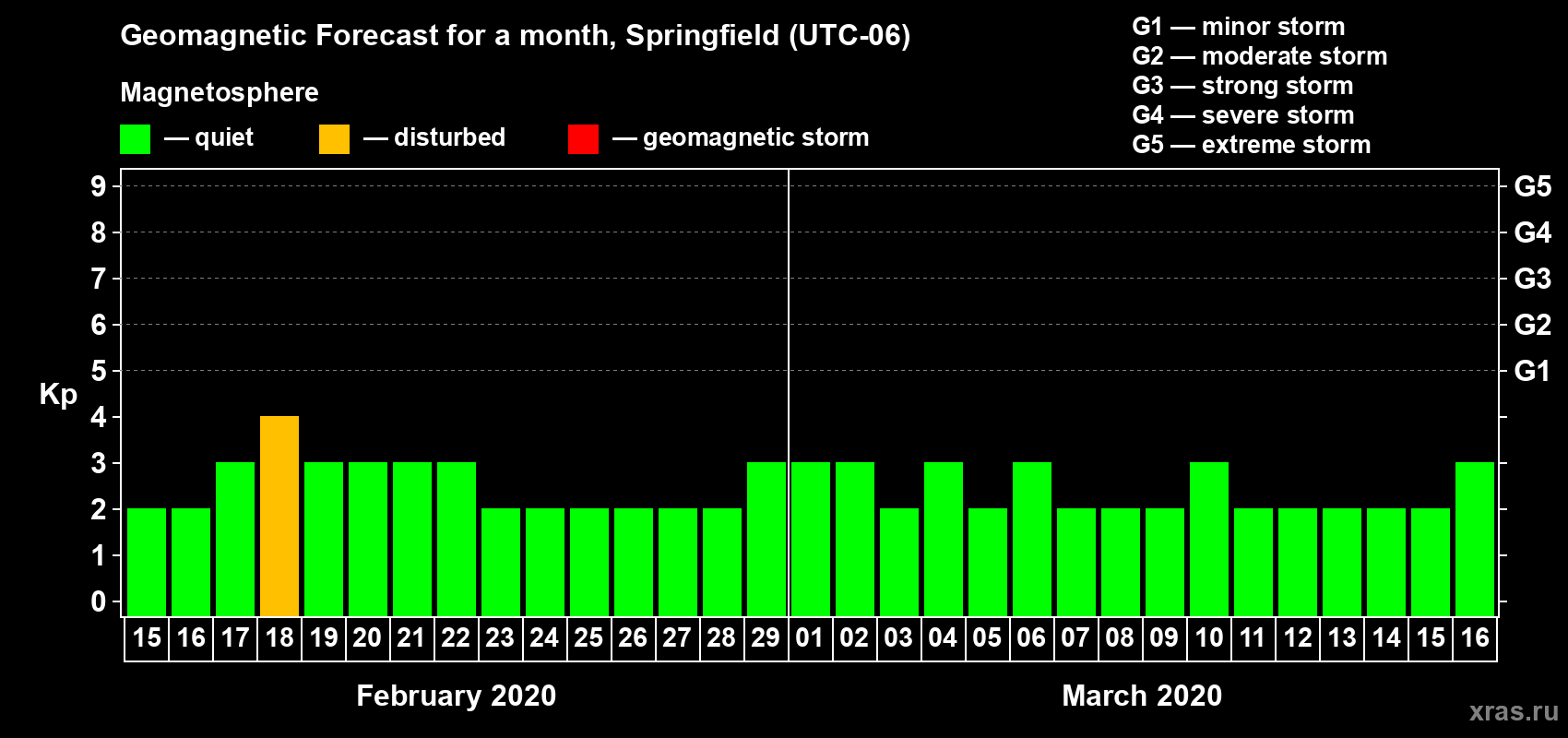 Geomagnetic storm forecast in Springfield for Feb 15, 2020