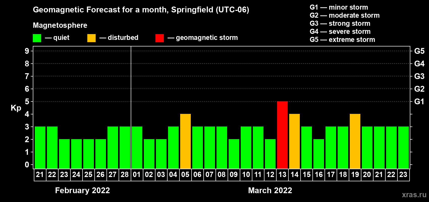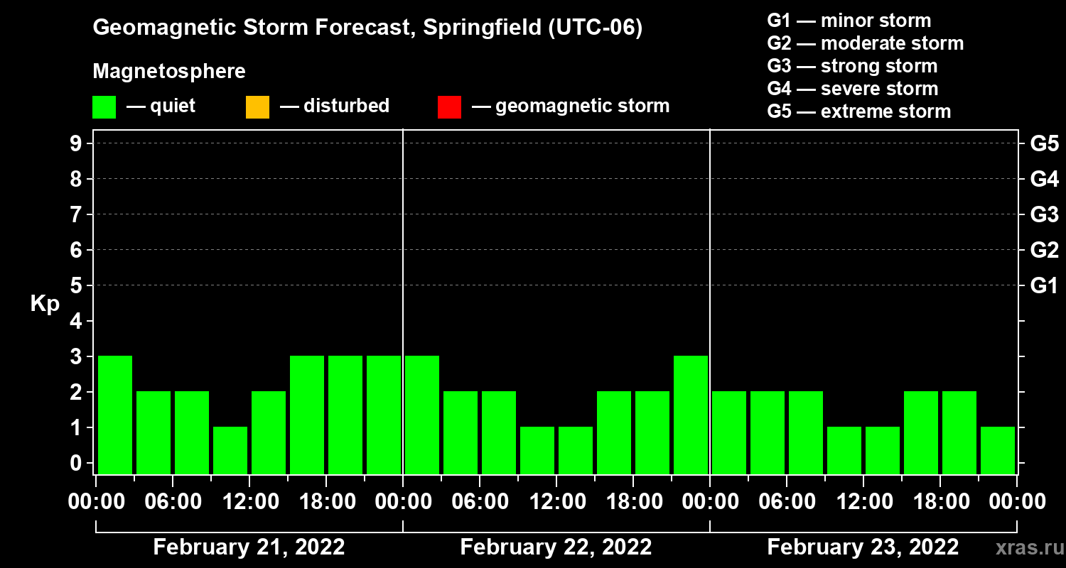 Geomagnetic storm forecast in Springfield for Feb 21, 2022