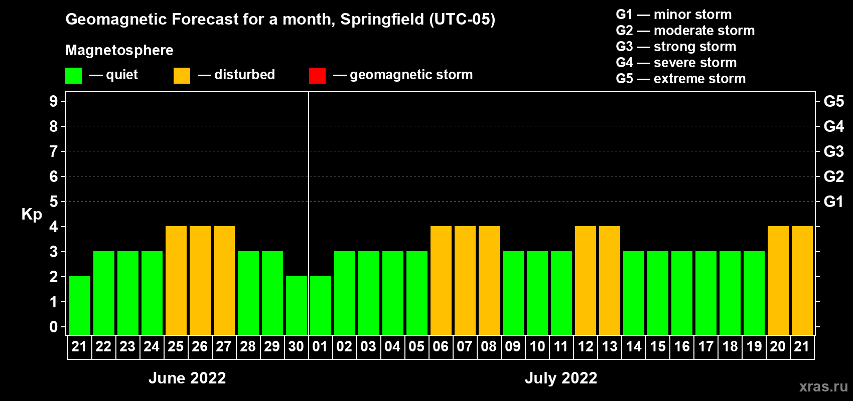 Geomagnetic storm forecast in Springfield for Jun 21, 2022