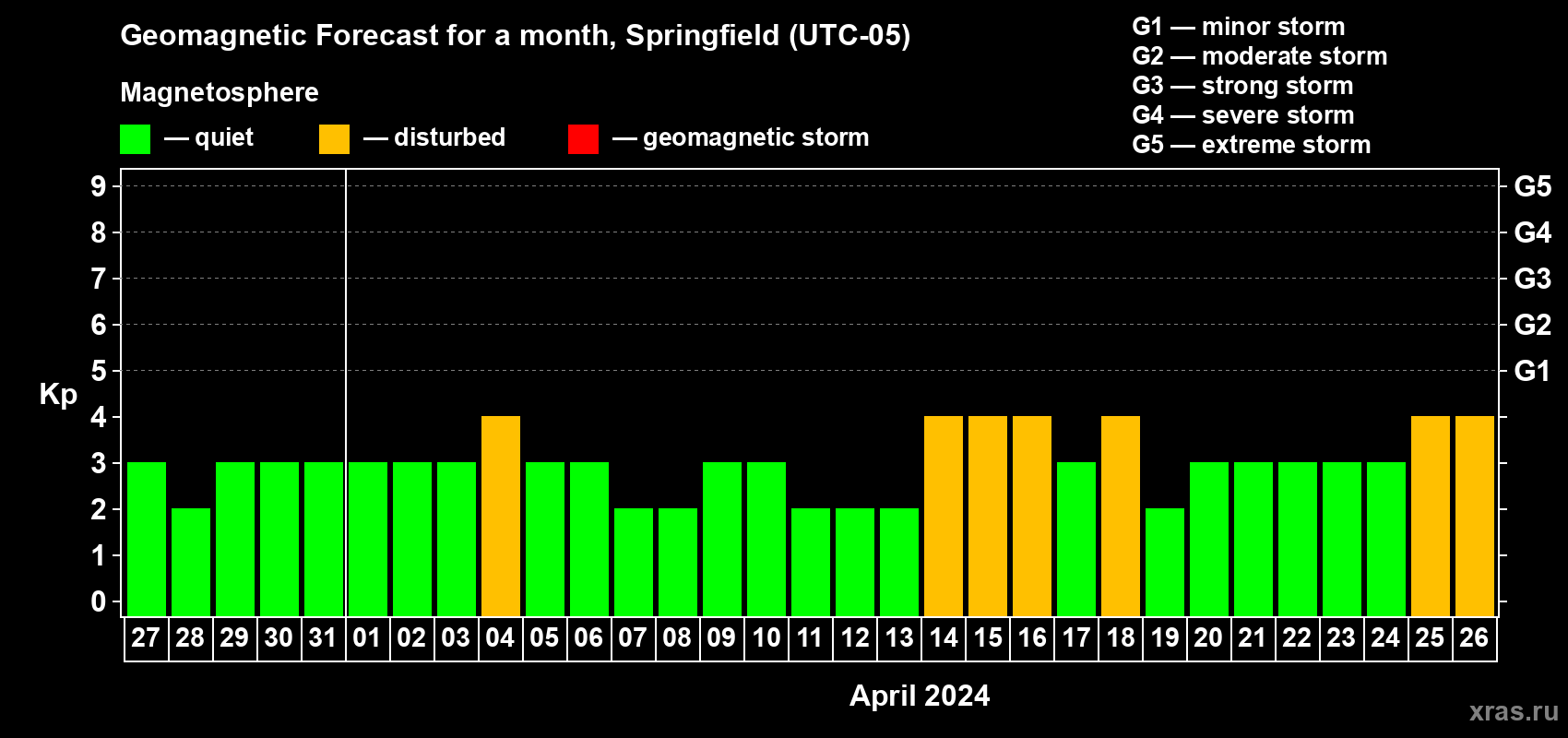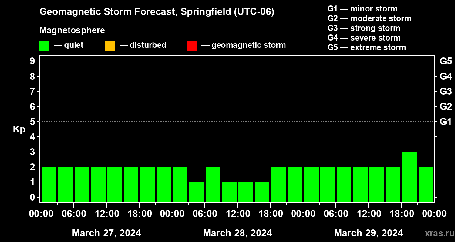 Geomagnetic storm forecast in Springfield for Mar 27, 2024