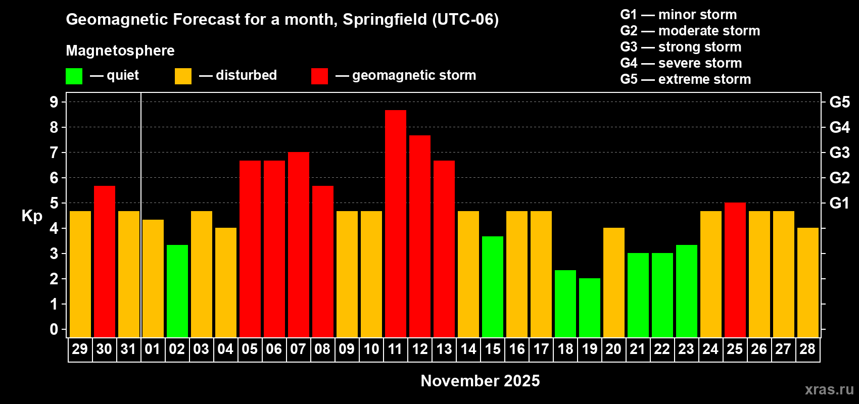 Geomagnetic storm forecast in Springfield for Oct 29, 2025