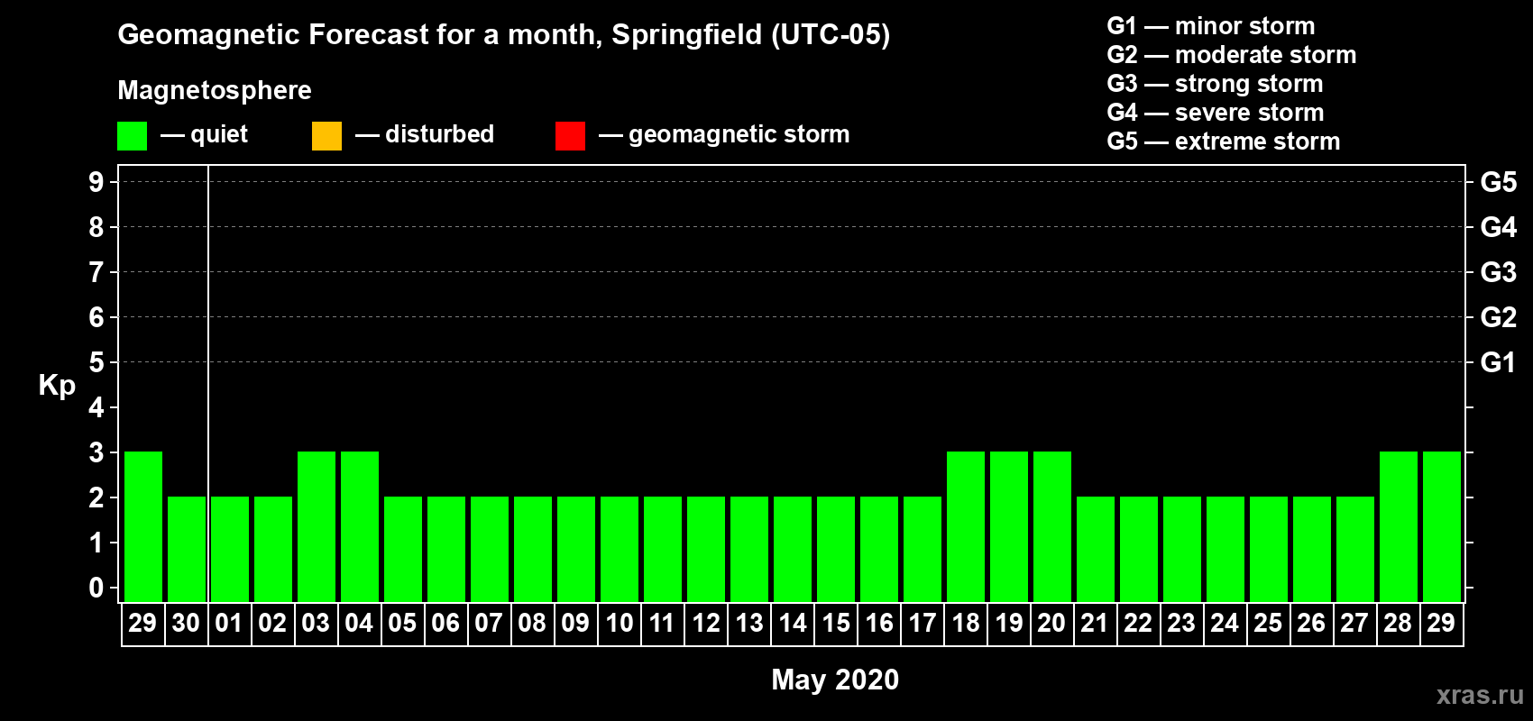 Geomagnetic storm forecast in Springfield for Apr 29, 2020