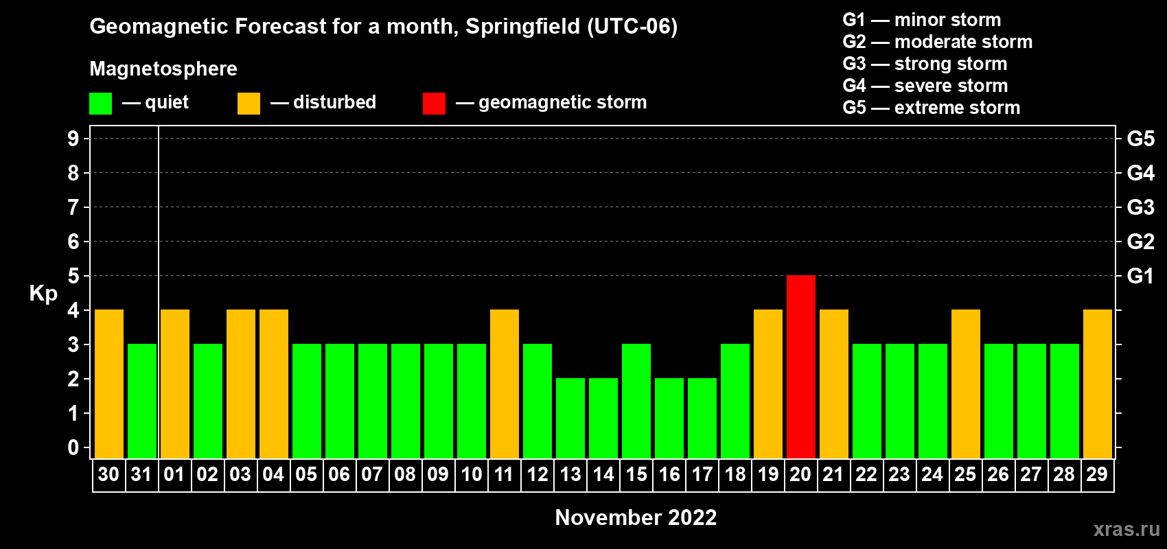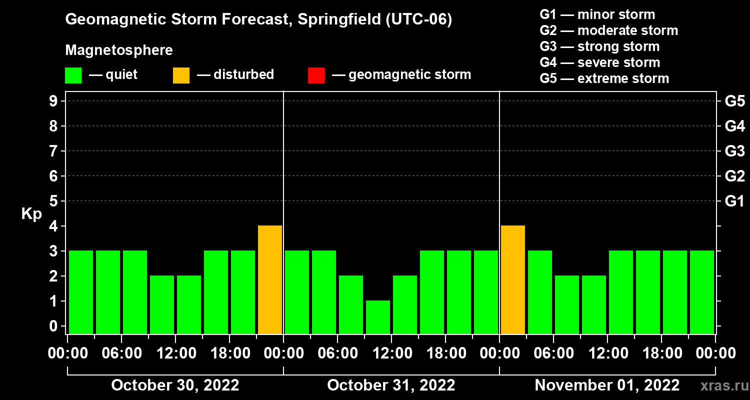 Geomagnetic storm forecast in Springfield for Oct 30, 2022