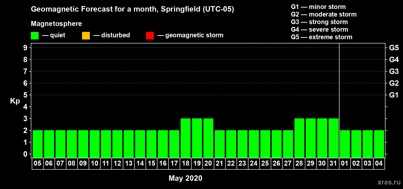 Geomagnetic storm forecast in Springfield for May 05, 2020