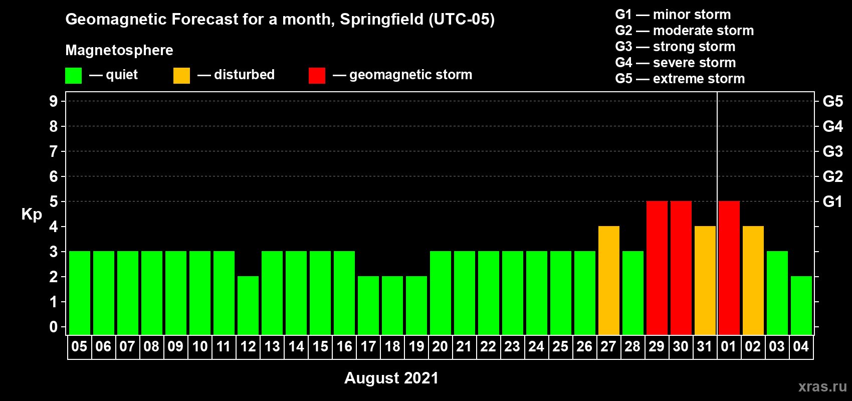 Geomagnetic storm forecast in Springfield for Aug 05, 2021