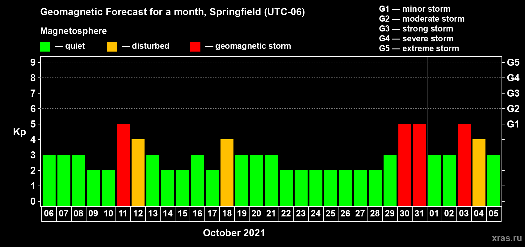 Geomagnetic storm forecast in Springfield for Oct 06, 2021