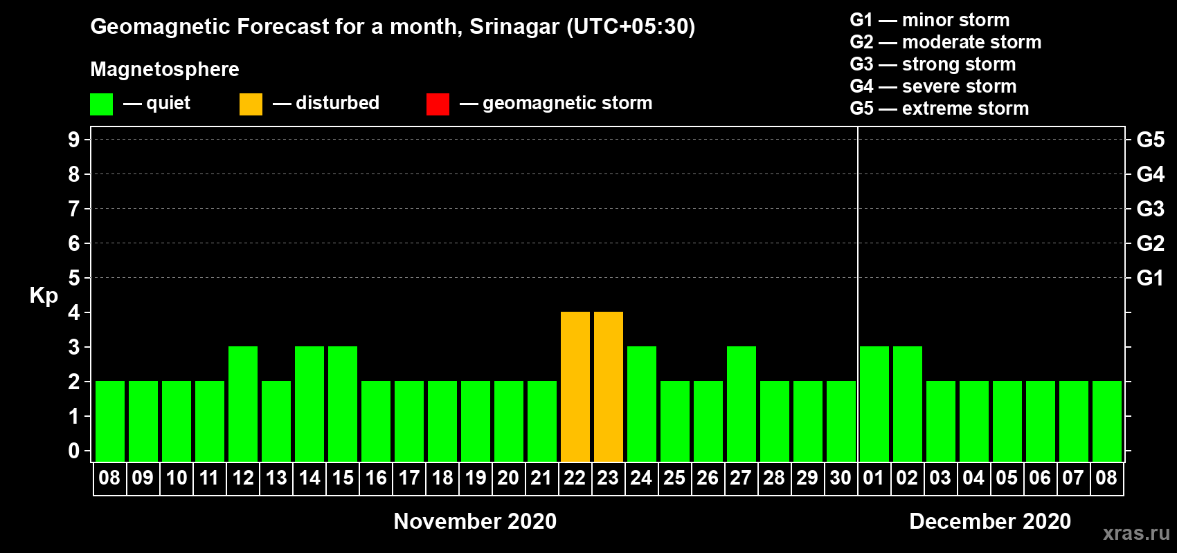 Geomagnetic activity forecast in Srinagar — Nov 08, 2020
