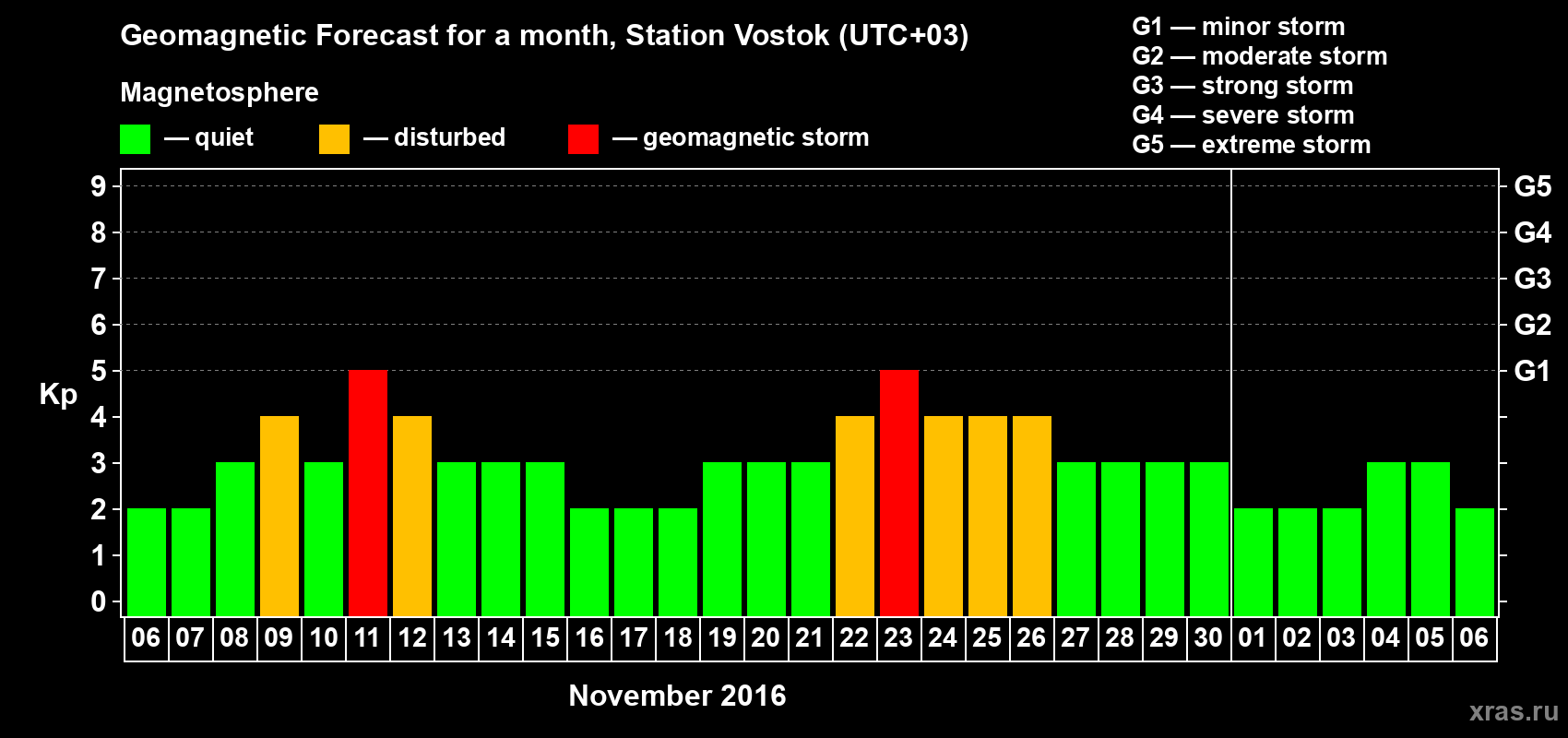 Geomagnetic storm forecast in Station Vostok for Nov 06, 2016