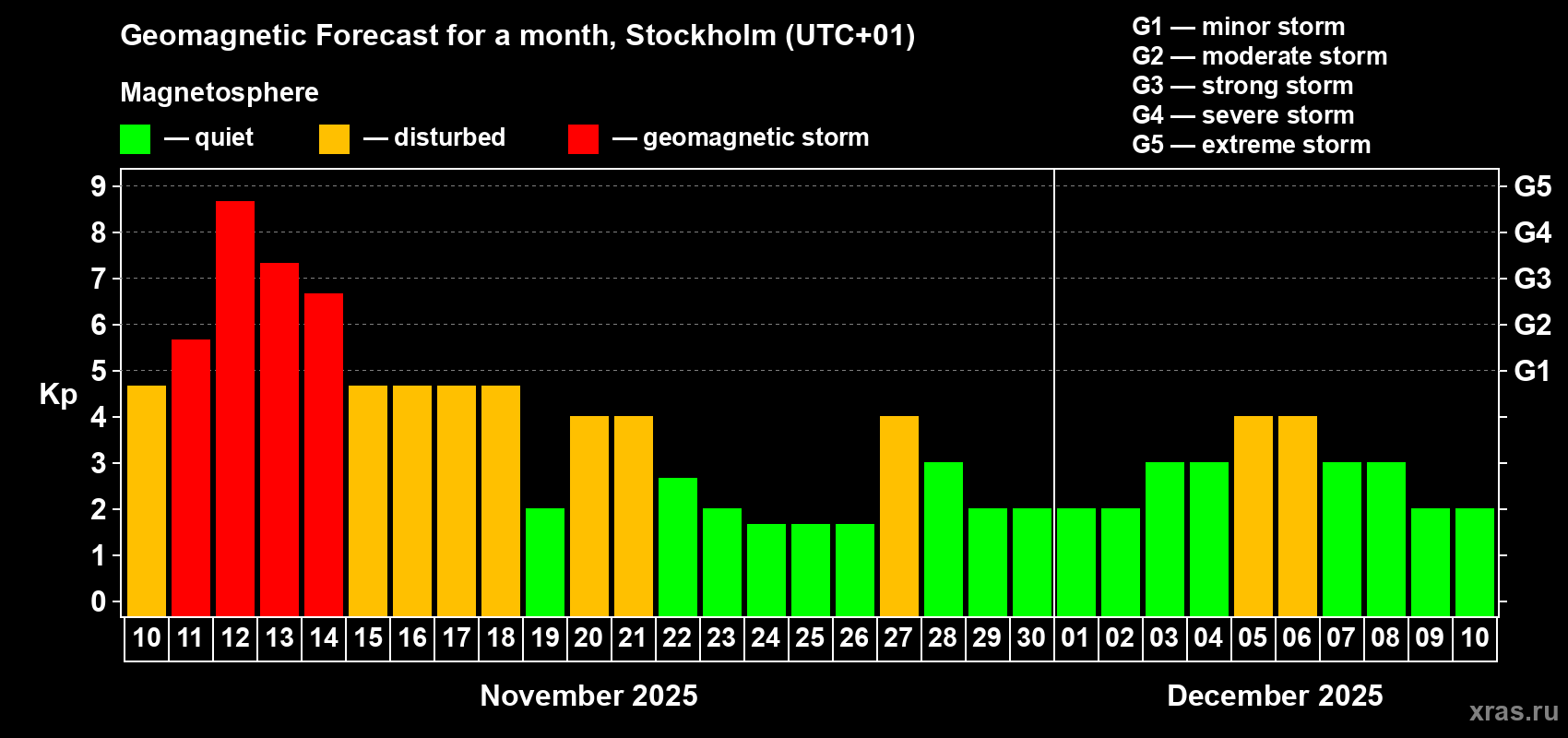 Geomagnetic storm forecast in Stockholm for Nov 10, 2025