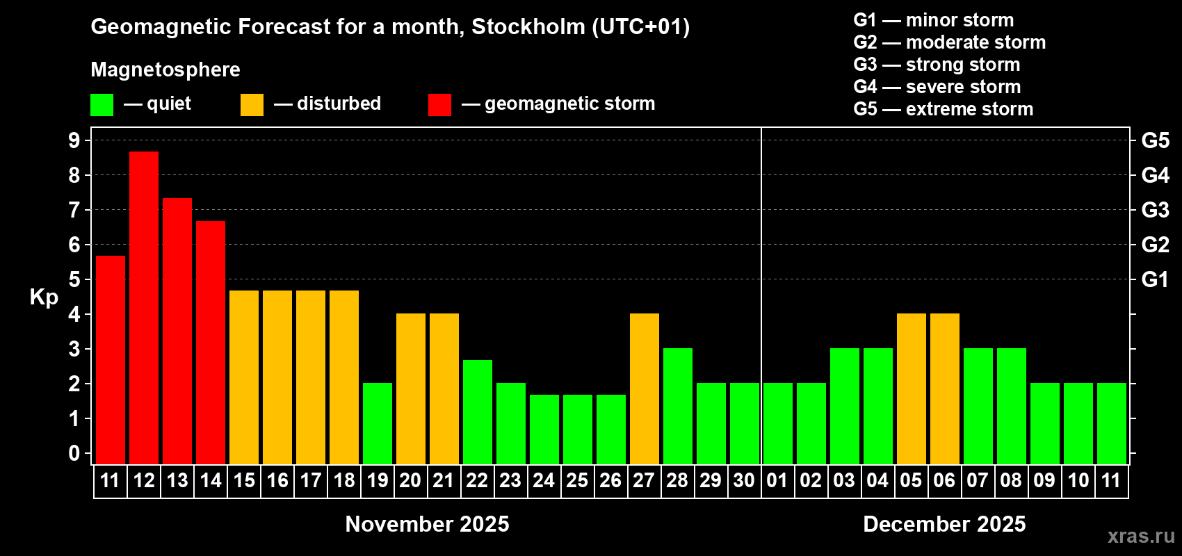 Geomagnetic storm forecast in Stockholm for Nov 11, 2025