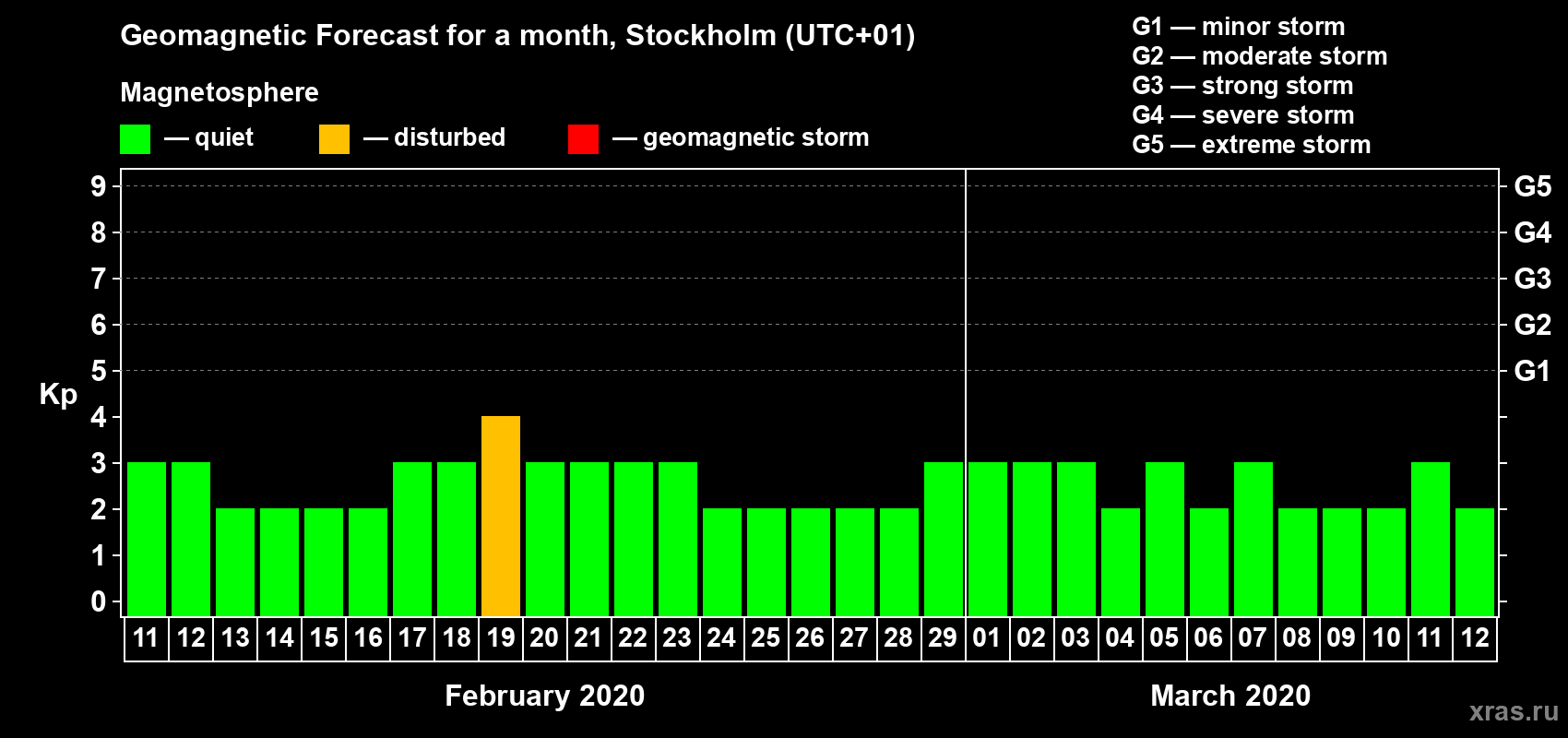 Geomagnetic storm forecast in Stockholm for Feb 11, 2020
