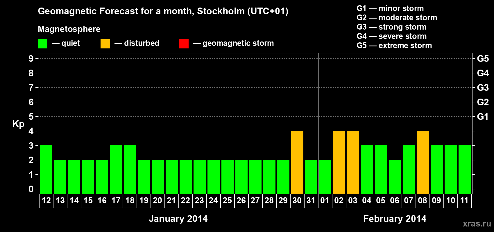 Geomagnetic storm forecast in Stockholm for Jan 12, 2014