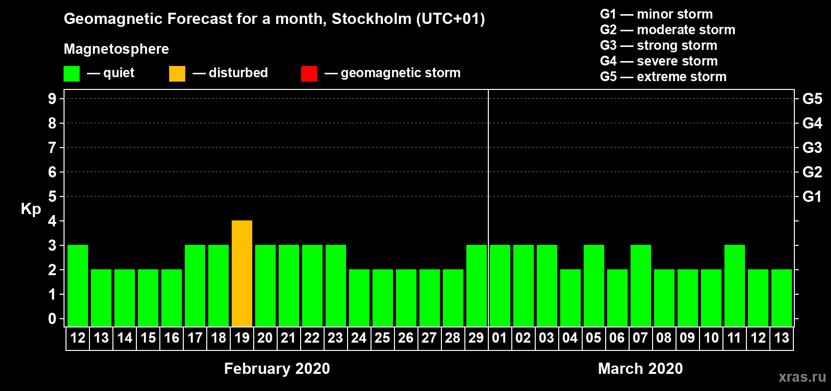 Geomagnetic storm forecast in Stockholm for Feb 12, 2020