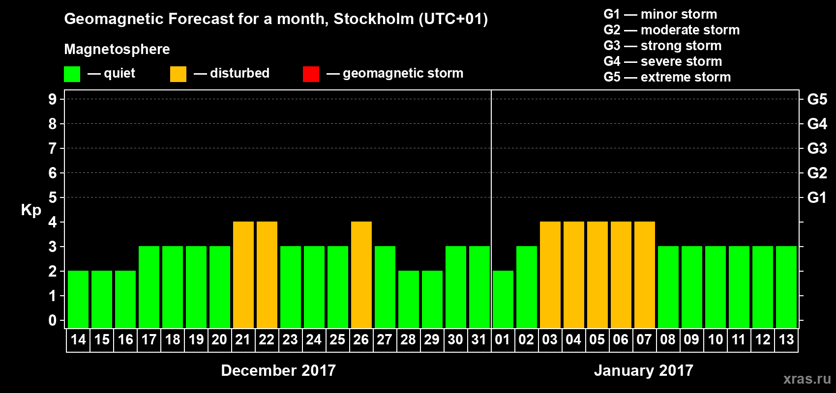 Geomagnetic storm forecast in Stockholm for Dec 14, 2016