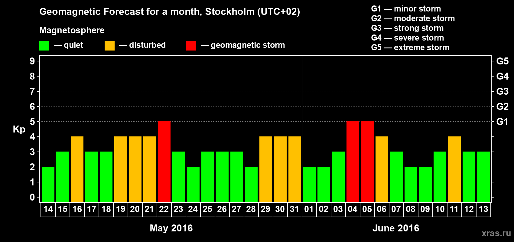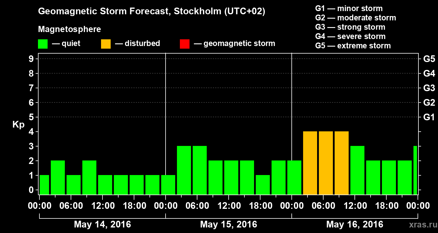 Geomagnetic storm forecast in Stockholm for May 14, 2016