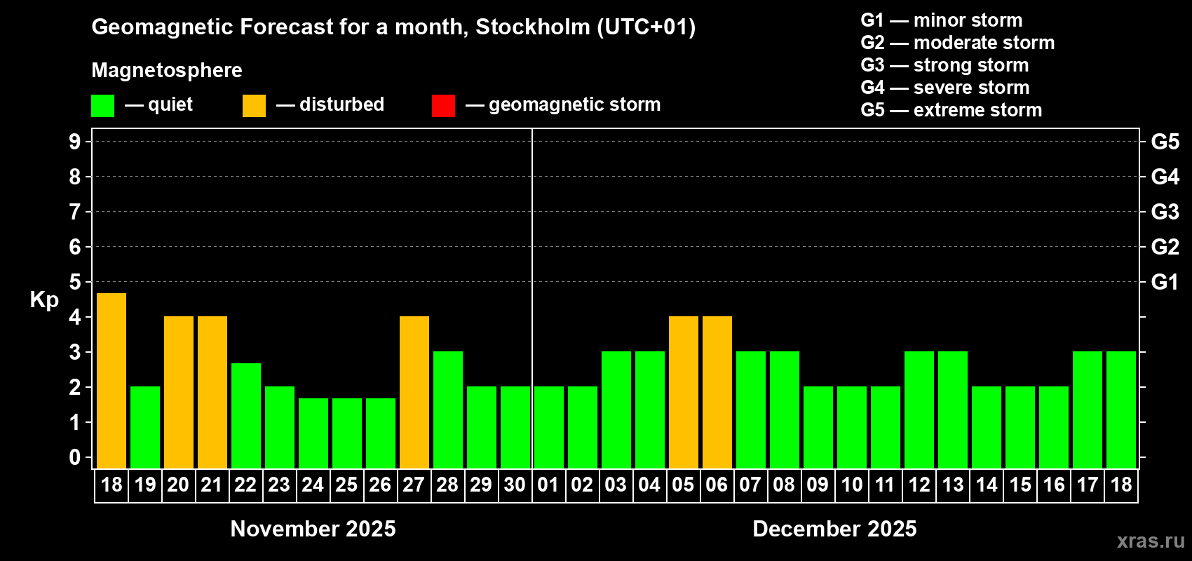 Geomagnetic storm forecast in Stockholm for Nov 18, 2025