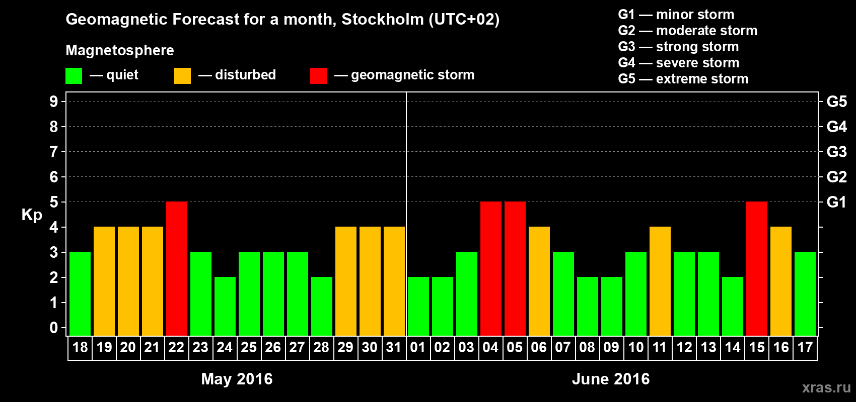 Geomagnetic storm forecast in Stockholm for May 18, 2016