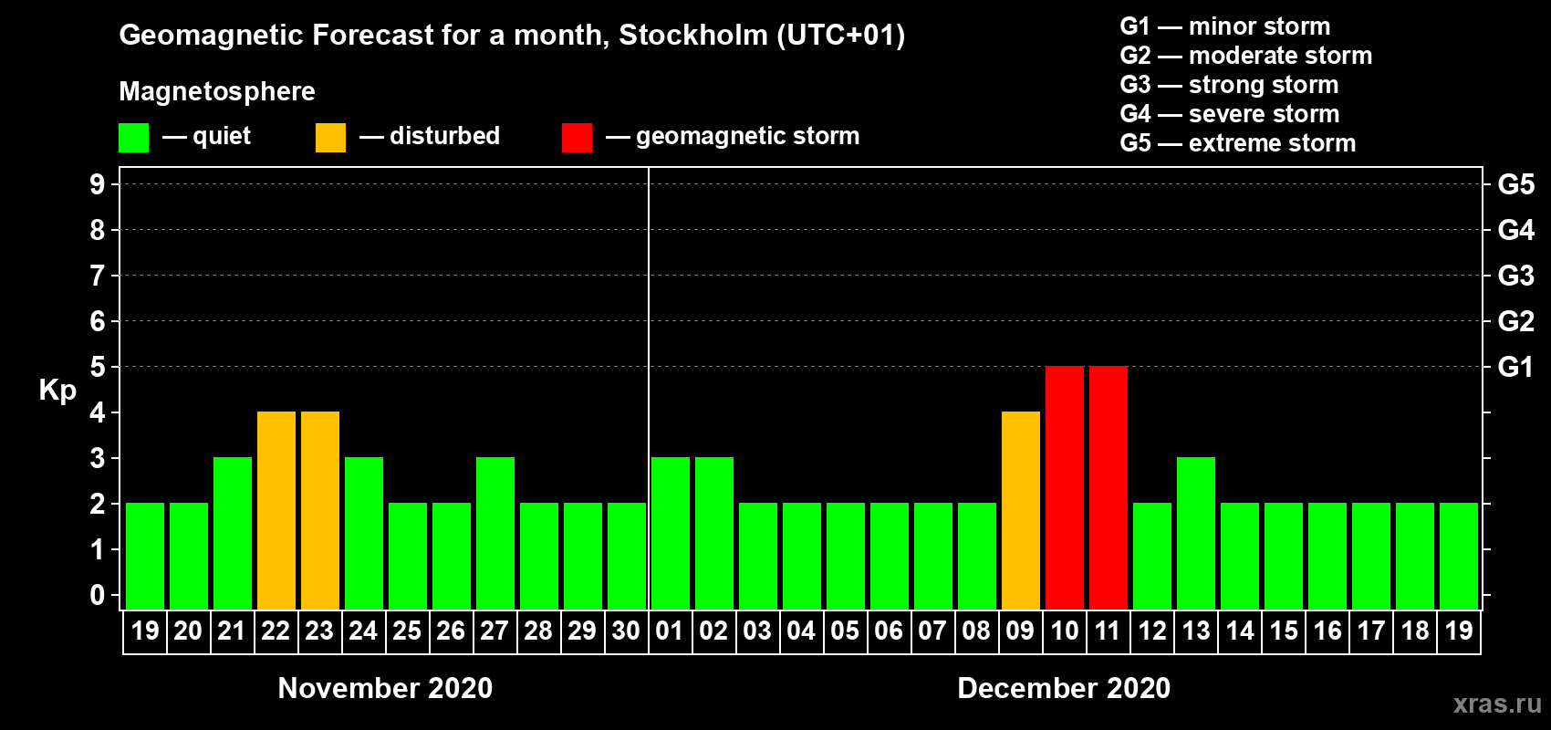 Geomagnetic storm forecast in Stockholm for Nov 19, 2020