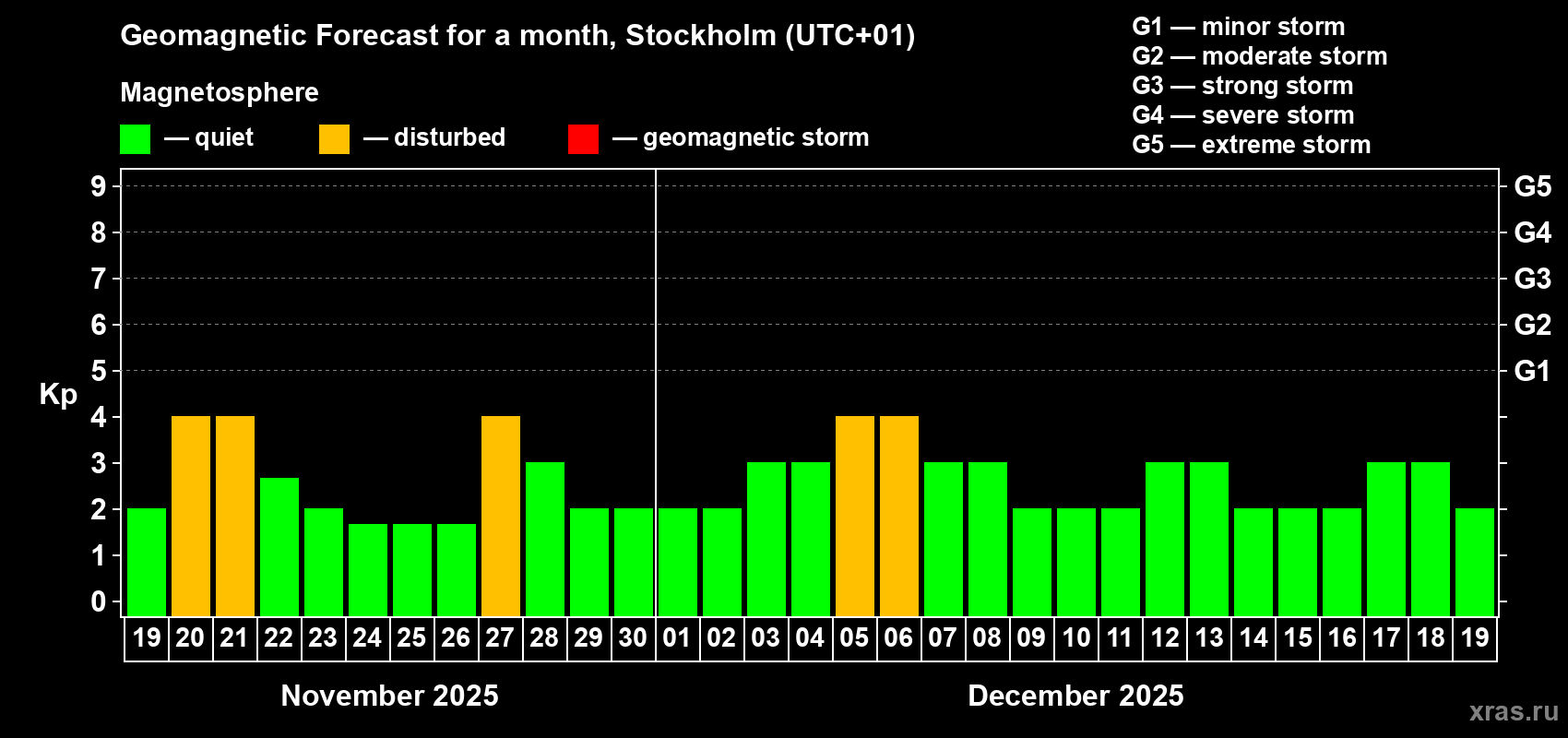 Geomagnetic storm forecast in Stockholm for Nov 19, 2025