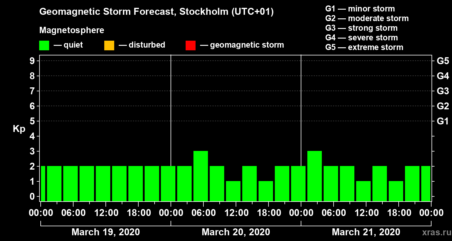 Geomagnetic storm forecast in Stockholm for Mar 19, 2020