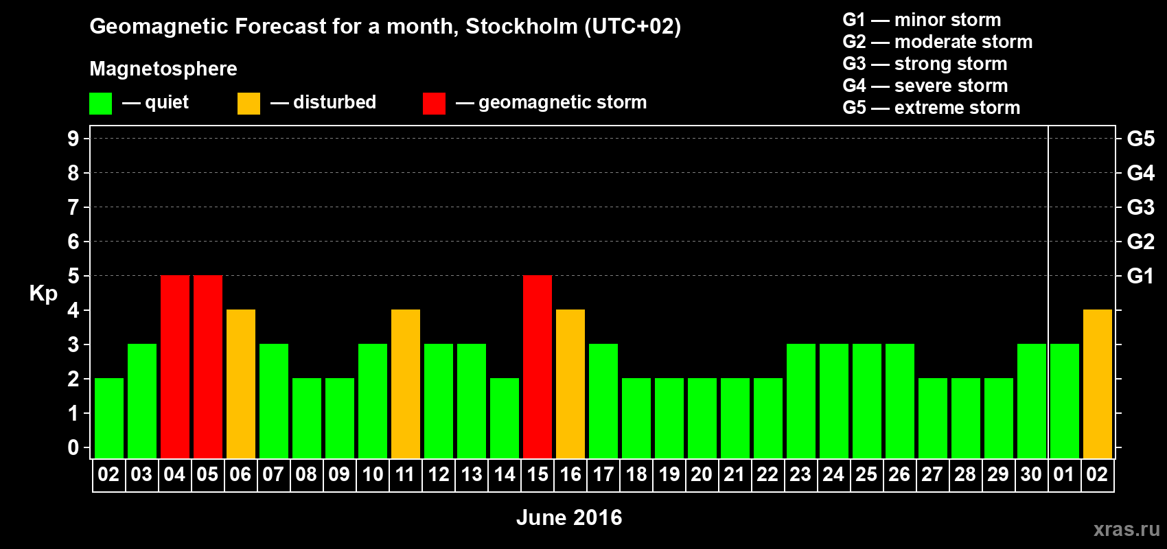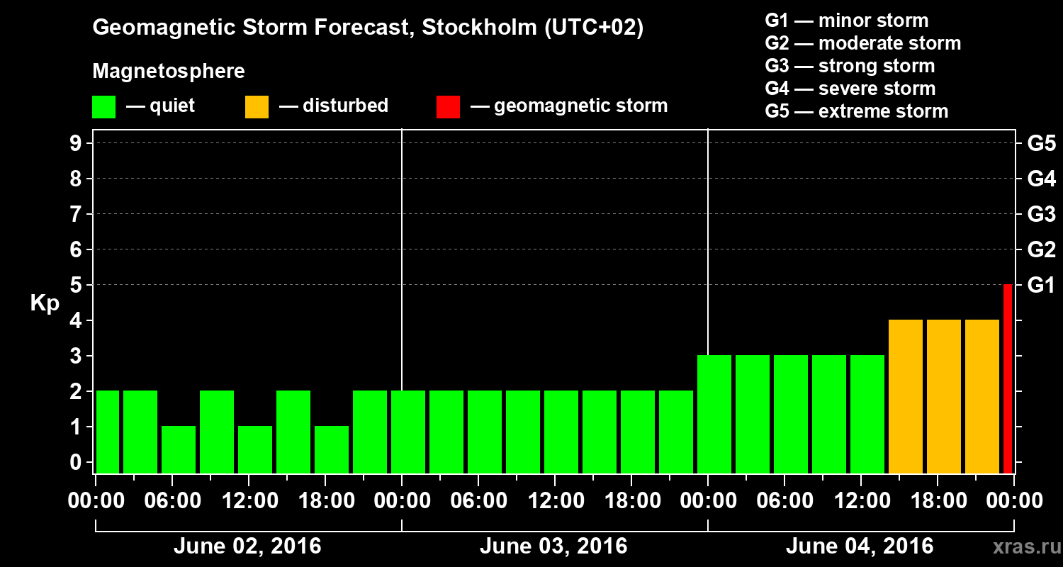 Geomagnetic storm forecast in Stockholm for Jun 02, 2016