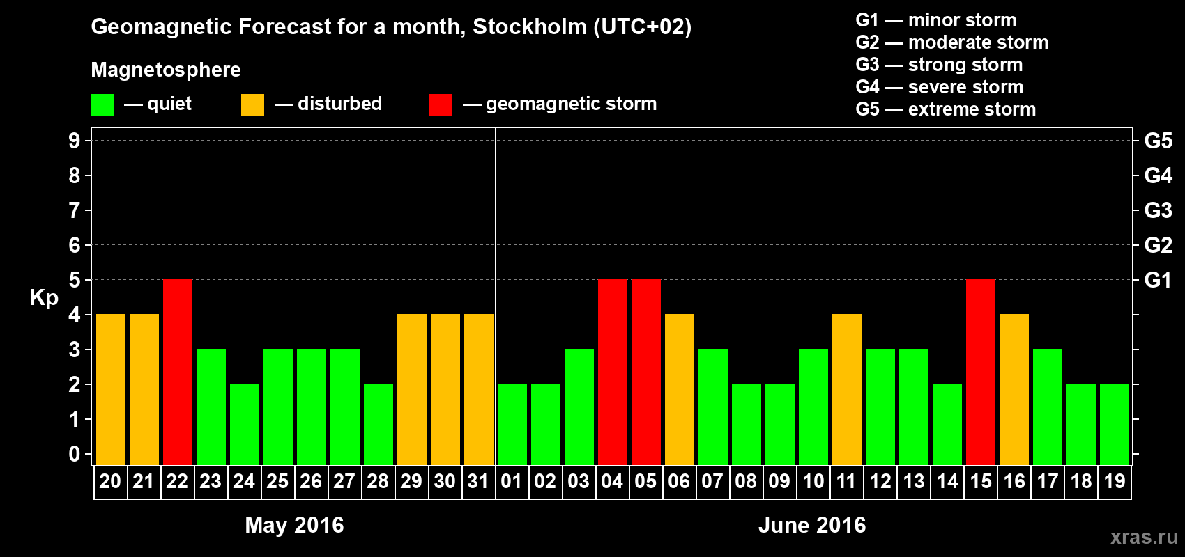 Geomagnetic storm forecast in Stockholm for May 20, 2016
