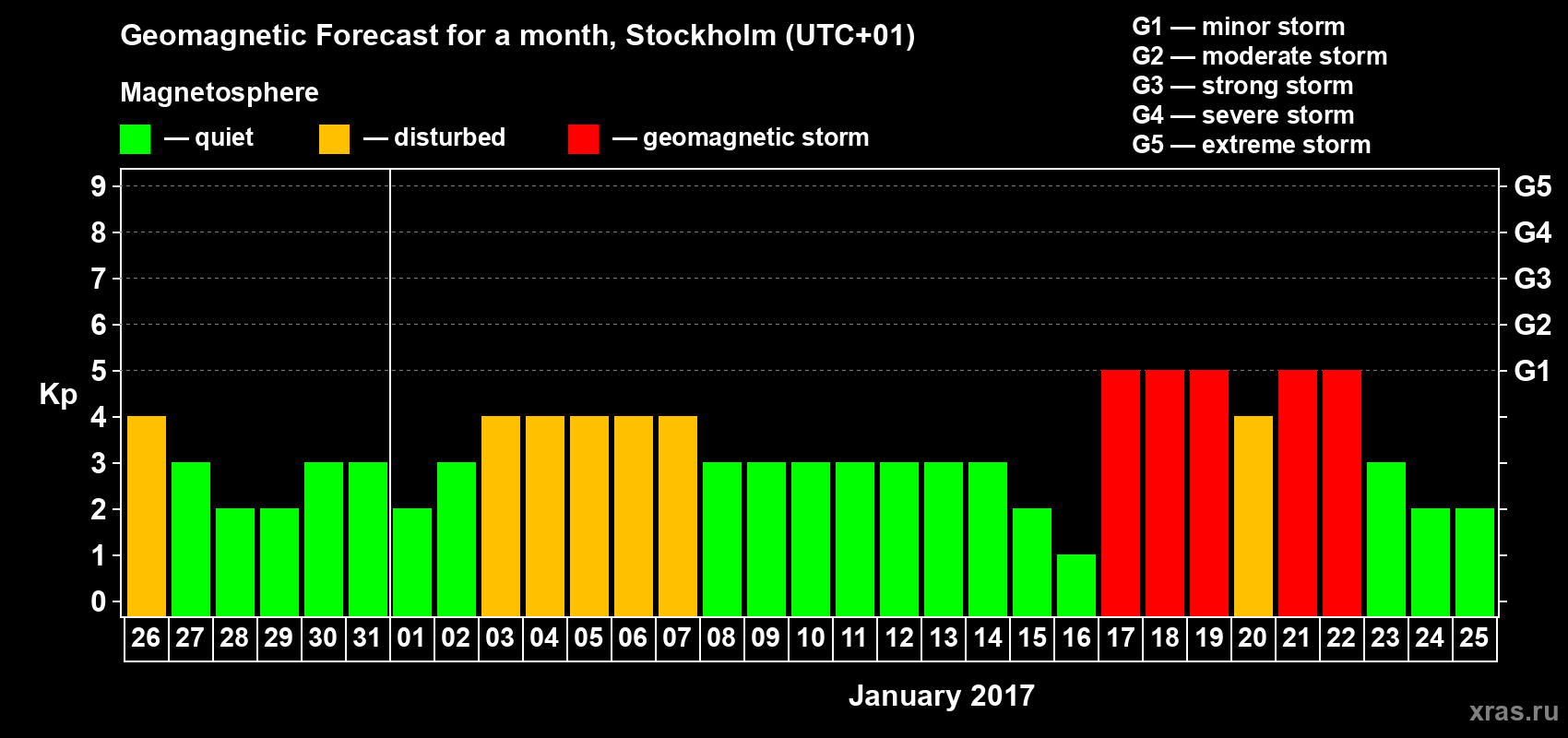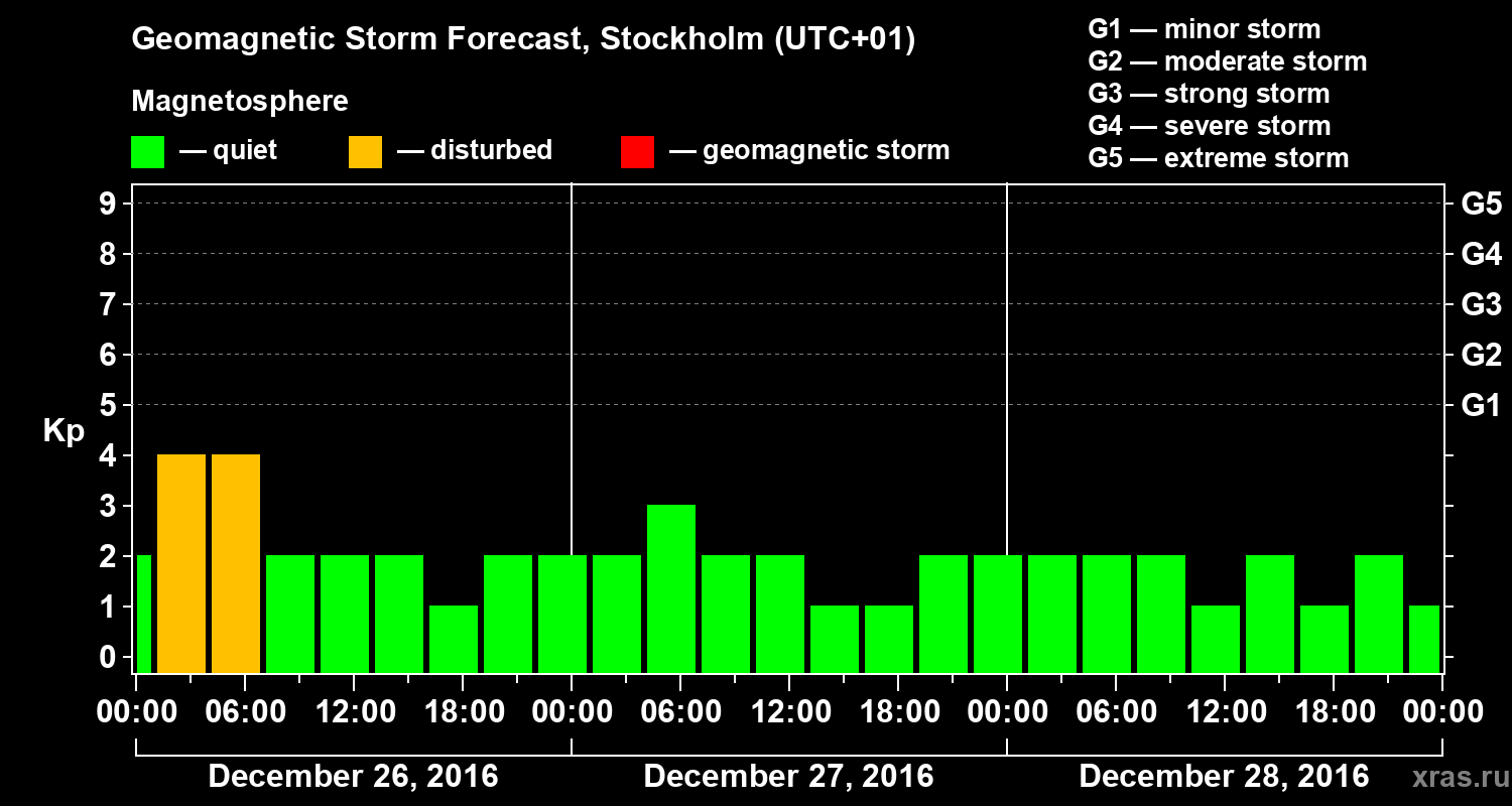 Geomagnetic storm forecast in Stockholm for Dec 26, 2016