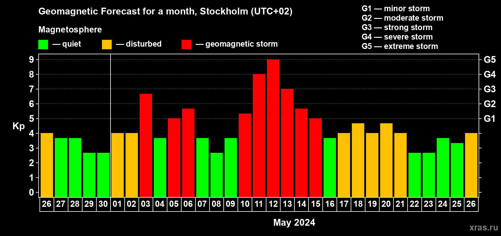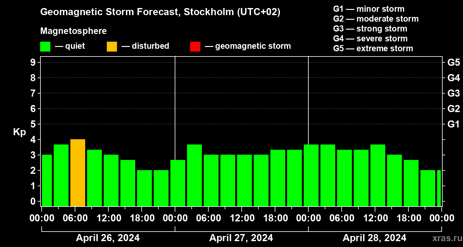 Geomagnetic storm forecast in Stockholm for Apr 26, 2024