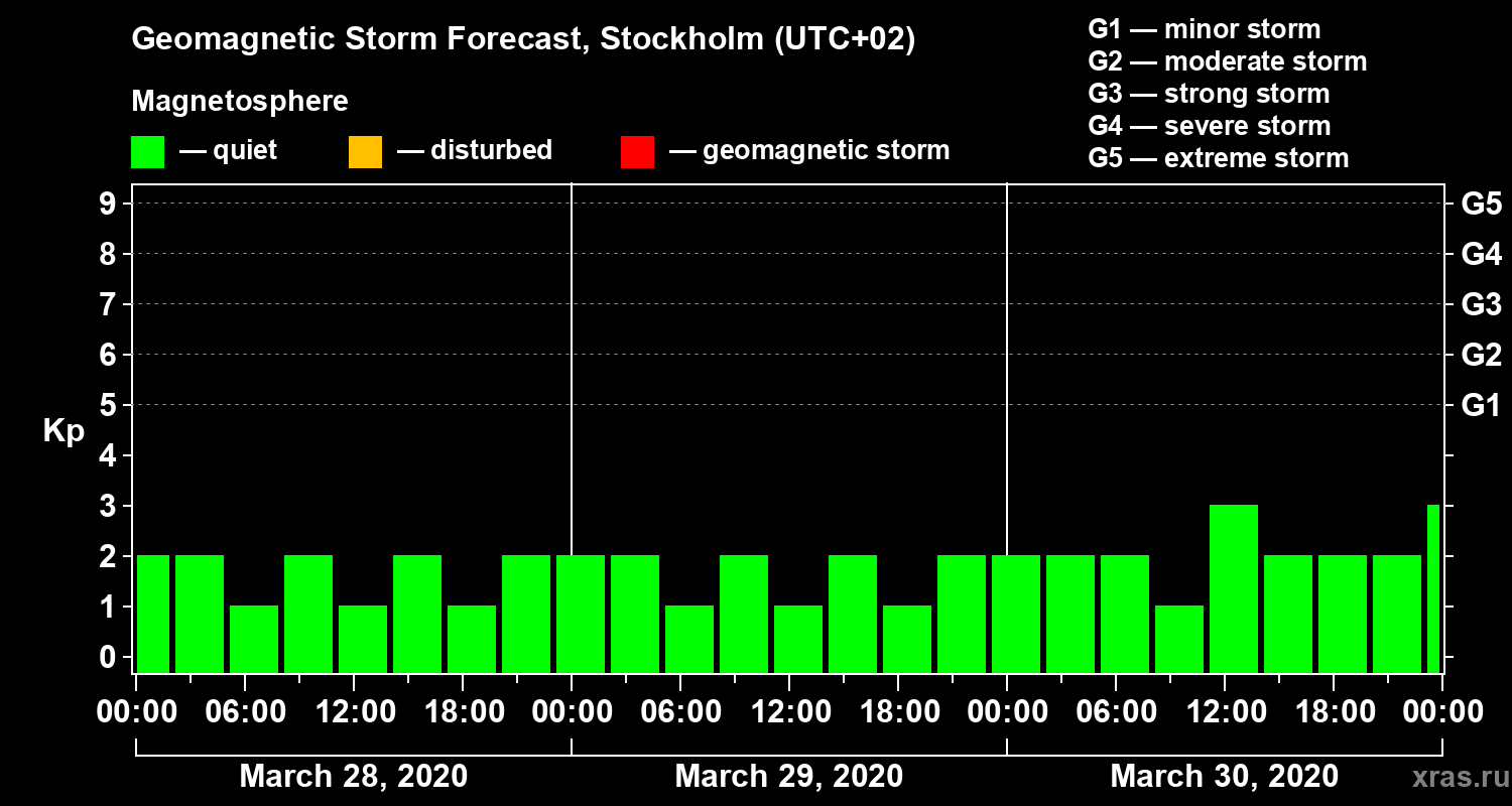 Geomagnetic storm forecast in Stockholm for Mar 28, 2020