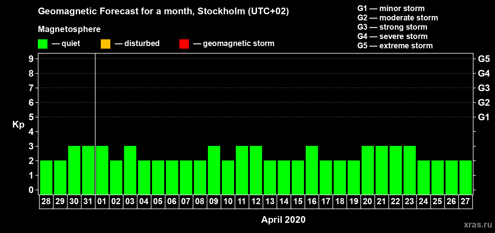 Geomagnetic activity forecast in Stockholm — Mar 28, 2020